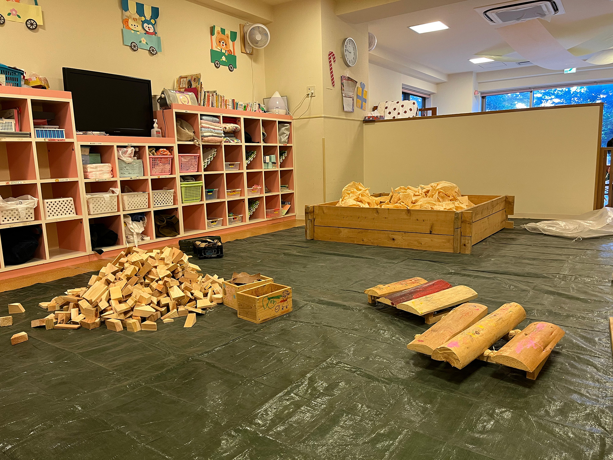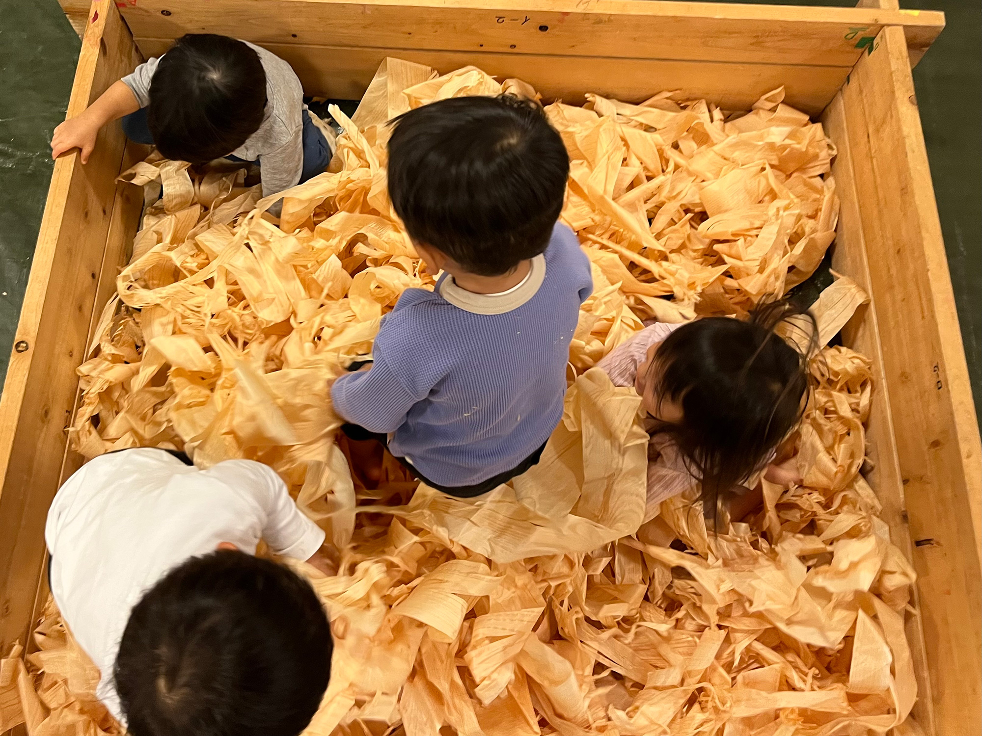工作遊び(木っ端クラフト)では紙やすりで削る、クレヨンで色付けする、グルーガン(大人が対応)でくっつけるなど、保育者や保護者が年齢に応じたフォローしながら、子ども達が自由に素材や道具を選んで想像力を働かせて自由に形作れるようにしたり、音楽遊び(マキンバ)では、選ぶ木によって音が変わることを実際に聞いて確認しながら、木材を並べて叩き音楽的な表現活動を楽しみ、0歳児クラスの低月齢児は檜のカンナ屑プールにて木の香りや手触りや味などを(口に含んだ場合に誤食しないように速やかに対応)身体全身で受け止めて乳児なりの探求活動行った。